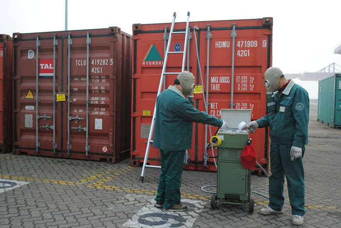 日前,中南地區(qū)第一臺(tái)最現(xiàn)代化的“移動(dòng)式微電腦施藥器”在長(zhǎng)沙新港投入使用。近日,湖南省進(jìn)出口檢驗(yàn)檢疫局技術(shù)人員,在長(zhǎng)沙新港首次對(duì)國(guó)際集裝箱采用封閉式消毒、熏蒸。這是我省使用的第一臺(tái)消毒熏蒸設(shè)備,結(jié)束商檢開箱施藥消毒熏蒸的歷史。