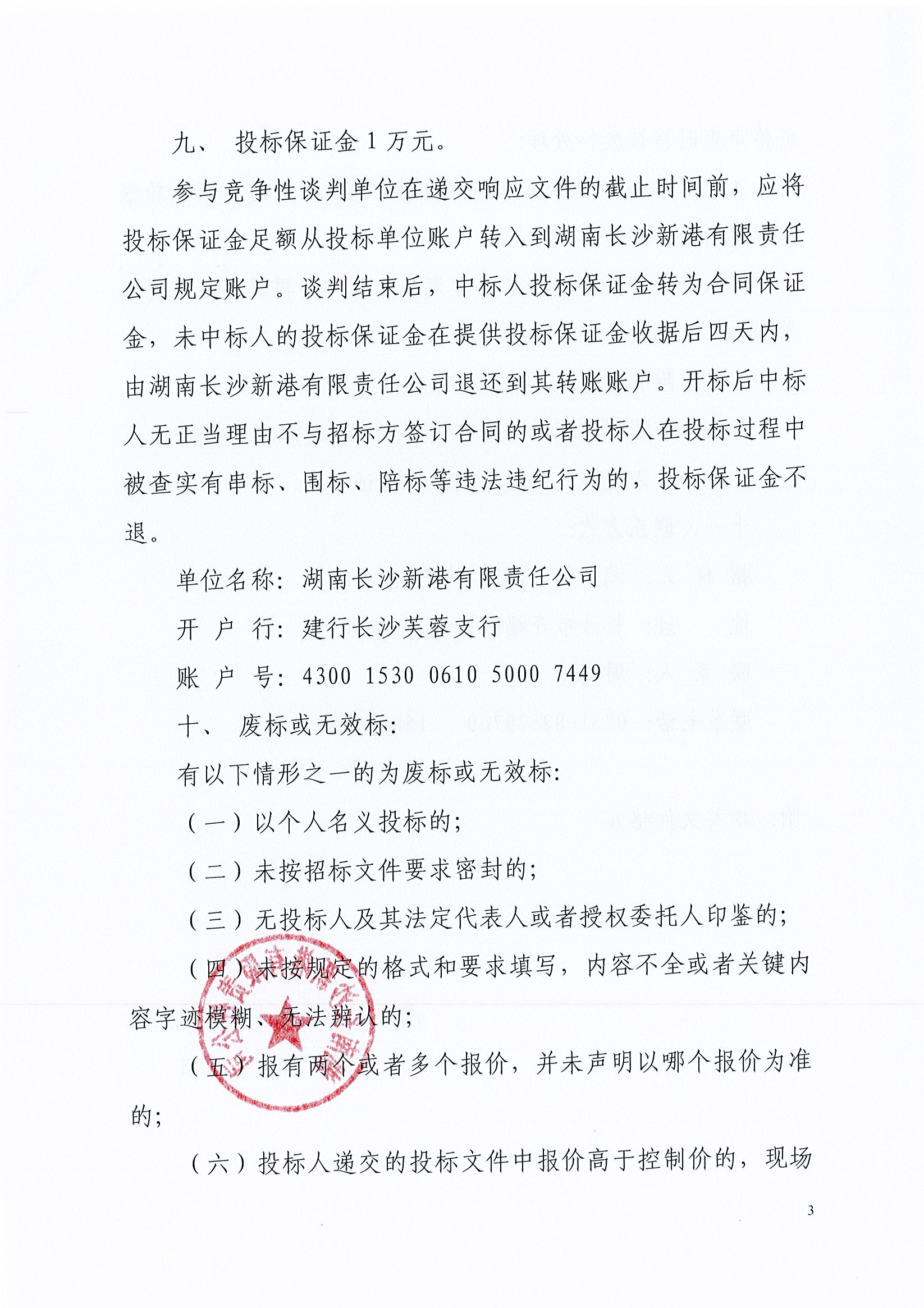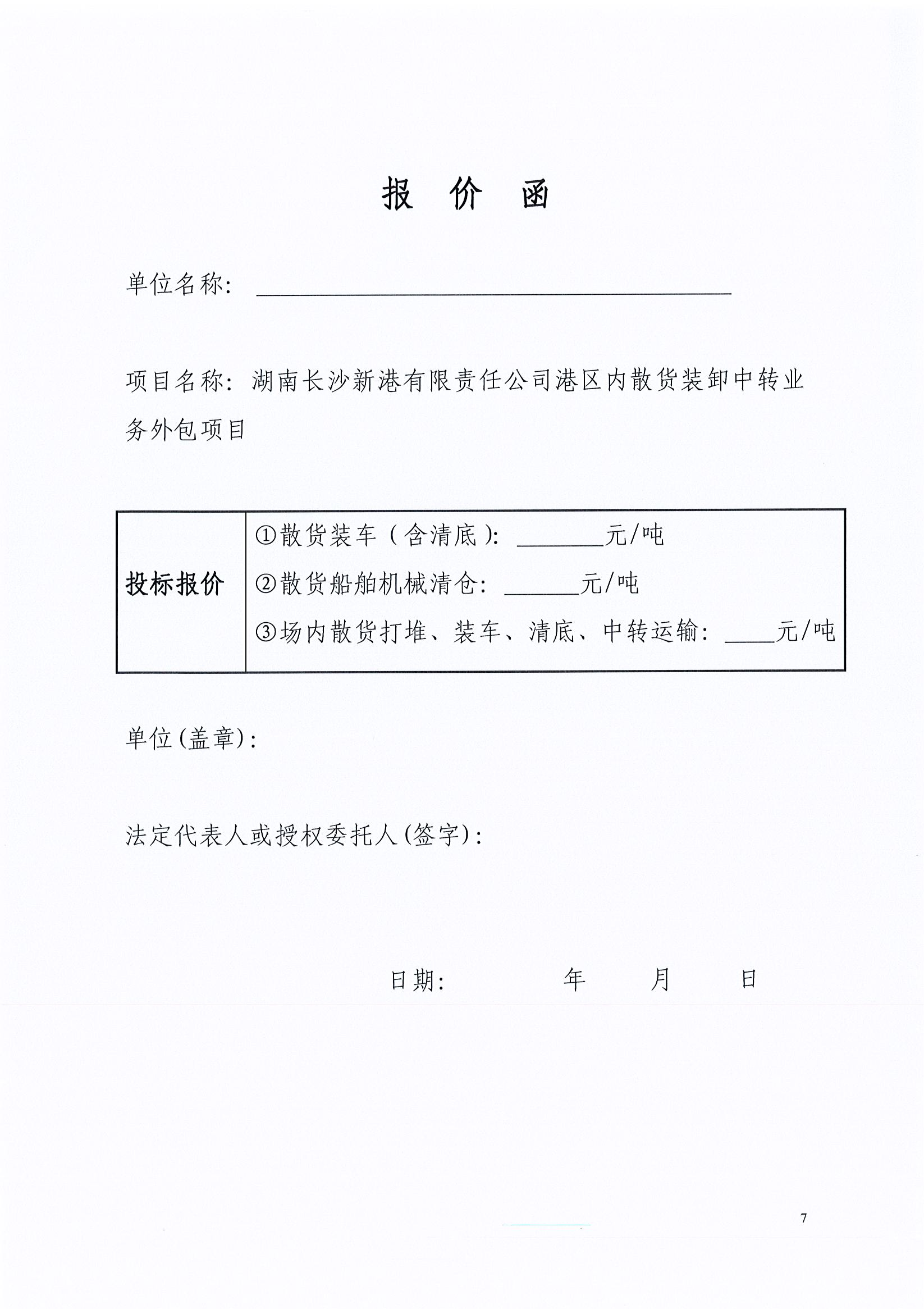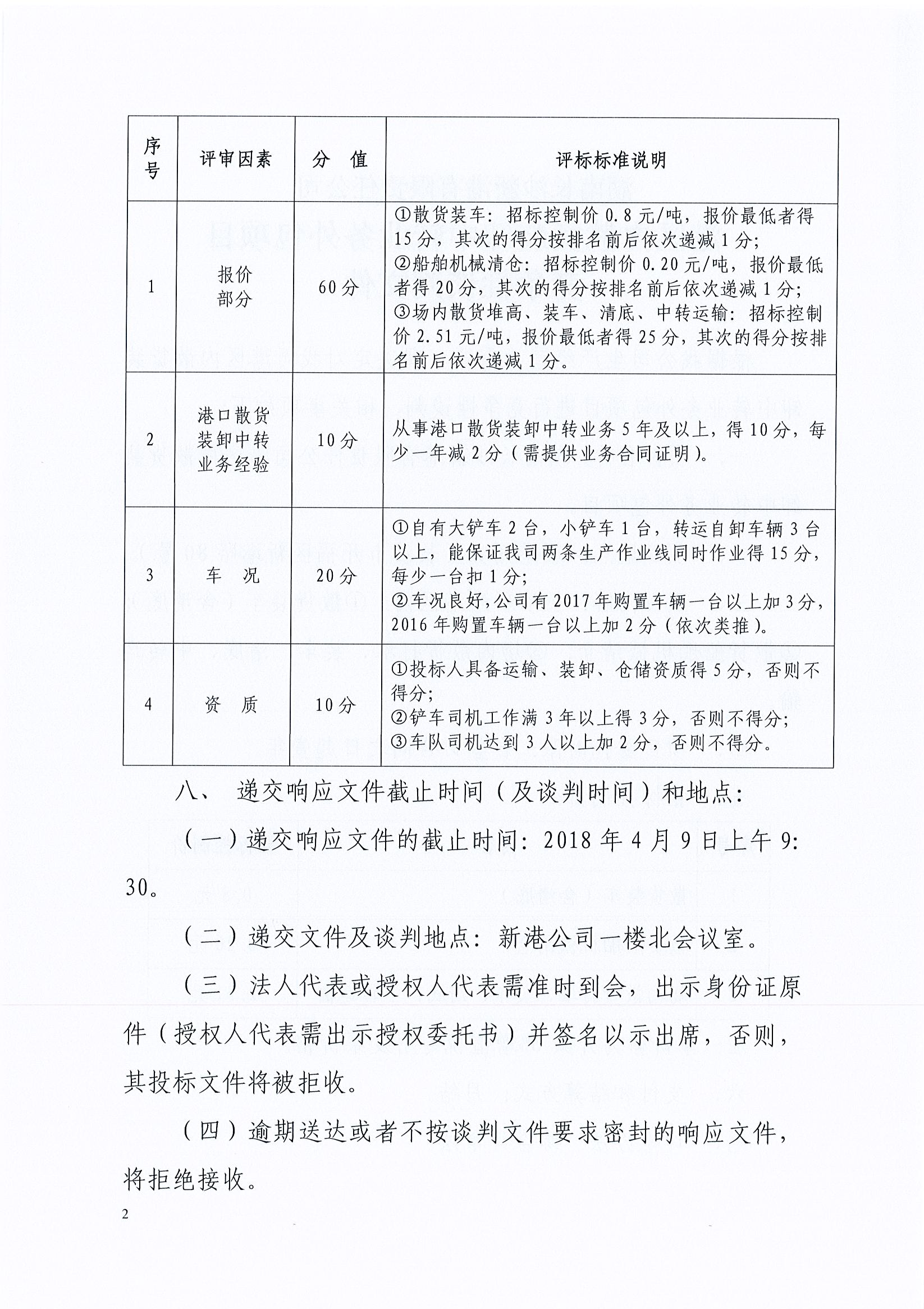 我公司決定對(duì)港區(qū)內(nèi)散貨裝卸中轉(zhuǎn)業(yè)務(wù)外包項(xiàng)目按照一般競爭性談判方式選擇外包單位,歡迎符合條件的單位參與項(xiàng)目的競爭談判。 一、 項(xiàng)目名稱:湖南長沙新港有限責(zé)任公司港區(qū)內(nèi)散貨裝卸中轉(zhuǎn)業(yè)務(wù)外包項(xiàng)目 二、 項(xiàng)目內(nèi)容: 長沙新港港區(qū)內(nèi):①散貨裝車(含清底);②散貨船舶機(jī)械清倉;③場內(nèi)散貨打堆、裝車、清底、中轉(zhuǎn)運(yùn)輸。 三、 項(xiàng)目委托期限:自簽訂合同之日起壹年。 四、 資格及資質(zhì)要求: (一)本項(xiàng)目不接受聯(lián)合體投標(biāo); (二)投標(biāo)人須自有大鏟車、小鏟車、轉(zhuǎn)運(yùn)自卸車輛,能保證我司兩條生產(chǎn)作業(yè)線同時(shí)作業(yè); (三)投標(biāo)人鏟車司機(jī)、車隊(duì)司機(jī)須持有相關(guān)職業(yè)資格證; (四)投標(biāo)人遞交響應(yīng)文件時(shí)須提交以下證明材料(復(fù)印件需加蓋公章): 1.企業(yè)法人營業(yè)執(zhí)照副本復(fù)印件; 2.法人資格證明書或具有單位公章及法定代表人簽章的授權(quán)委托書、法人身份證原件(或復(fù)印件); 3.投標(biāo)人自有車輛購置證明材料、司機(jī)職業(yè)資格證明材料復(fù)印件; 4.投標(biāo)人類似項(xiàng)目業(yè)績證明材料; 5.投標(biāo)人身份證原件及復(fù)印件。 五、招標(biāo)文件的獲取方式:招標(biāo)文件見本公告附件,投標(biāo)人在投標(biāo)截止時(shí)間前可自行下載或前往我司515室領(lǐng)取。 六、遞交響應(yīng)文件截止時(shí)間(及談判時(shí)間)和地點(diǎn): (一)遞交響應(yīng)文件的截止時(shí)間:2018年4月9日上午9:30。 (二)遞交文件及談判地點(diǎn):新港公司一樓北會(huì)議室。 (三)法人代表或授權(quán)人代表需準(zhǔn)時(shí)到會(huì),出示身份證原件(授權(quán)人代表需出示授權(quán)委托書)并簽名以示出席,否則,其投標(biāo)文件將被拒收。 (四)逾期送達(dá)或者不按談判文件要求密封的響應(yīng)文件,將拒絕接收。 七、招 標(biāo) 方:湖南長沙新港有限責(zé)任公司 聯(lián) 系 人:周明德 聯(lián)系電話: 15874888034 2018年4月3日 附件:
