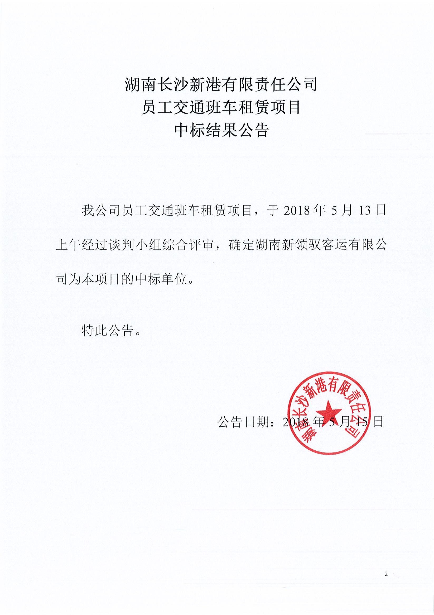 湖南長沙新港有限責(zé)任公司 員工交通班車租賃項(xiàng)目中標(biāo)結(jié)果公告