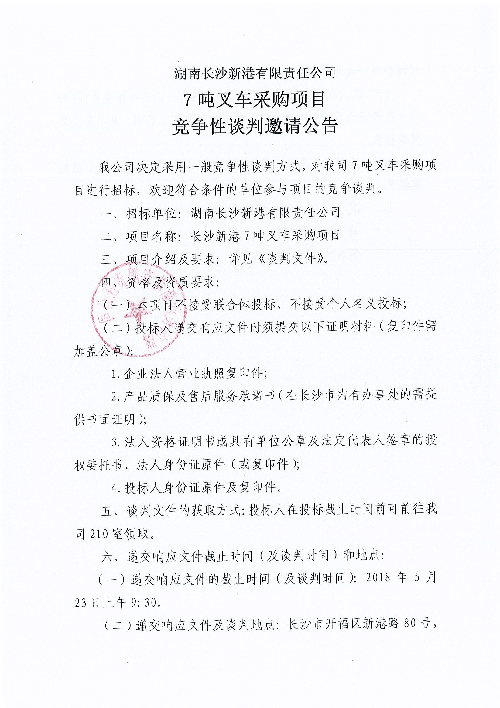湖南長沙新港有限責(zé)任公司 7噸叉車采購項目競爭性談判邀請公告