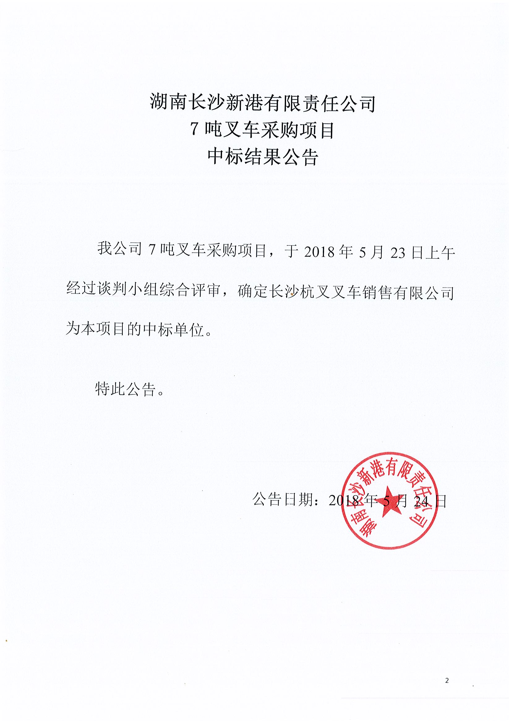 湖南長(zhǎng)沙新港有限責(zé)任公司 7噸叉車(chē)采購(gòu)項(xiàng)目中標(biāo)結(jié)果公告