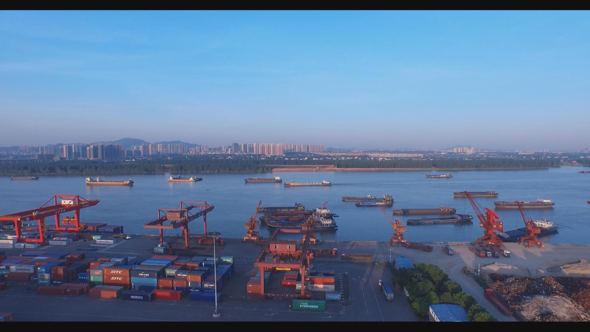 在岳陽城陵磯港,記者劉媛源介紹說:“為了更好地利用湖南良好的水運(yùn)資源,長沙與岳陽打出了一套漂亮的組合拳。我現(xiàn)在所在的位置就是岳陽市的城陵磯新港,經(jīng)過不到一天的航行,那批從長沙新港順流而下的貨物正在這里進(jìn)行新一輪的裝卸,這些貨物將乘坐我身后更加重量級的貨輪,從這里啟程運(yùn)往海外。”