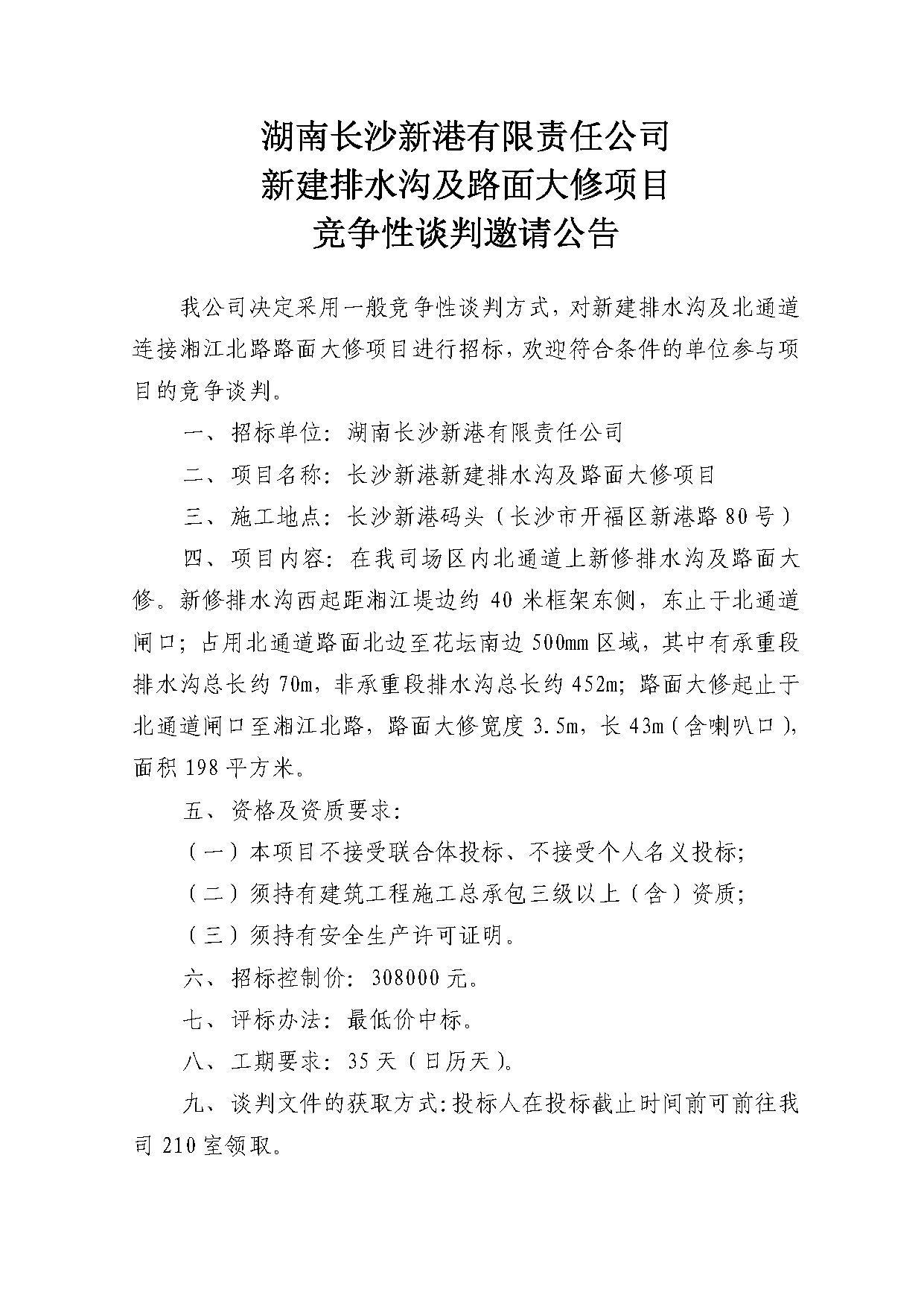 湖南長沙新港有限責(zé)任公司新建排水溝及路面大修項目邀請公告(延期)