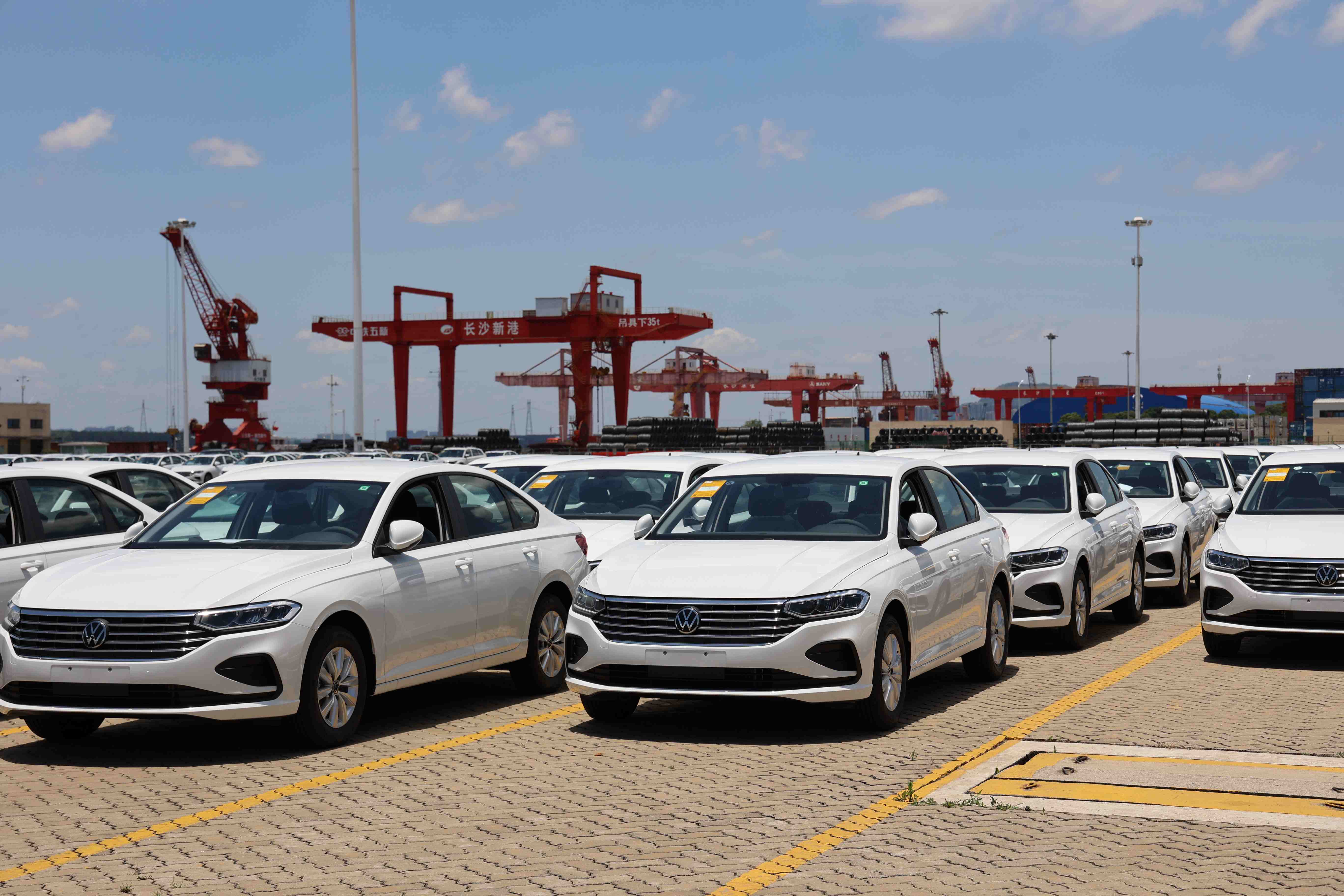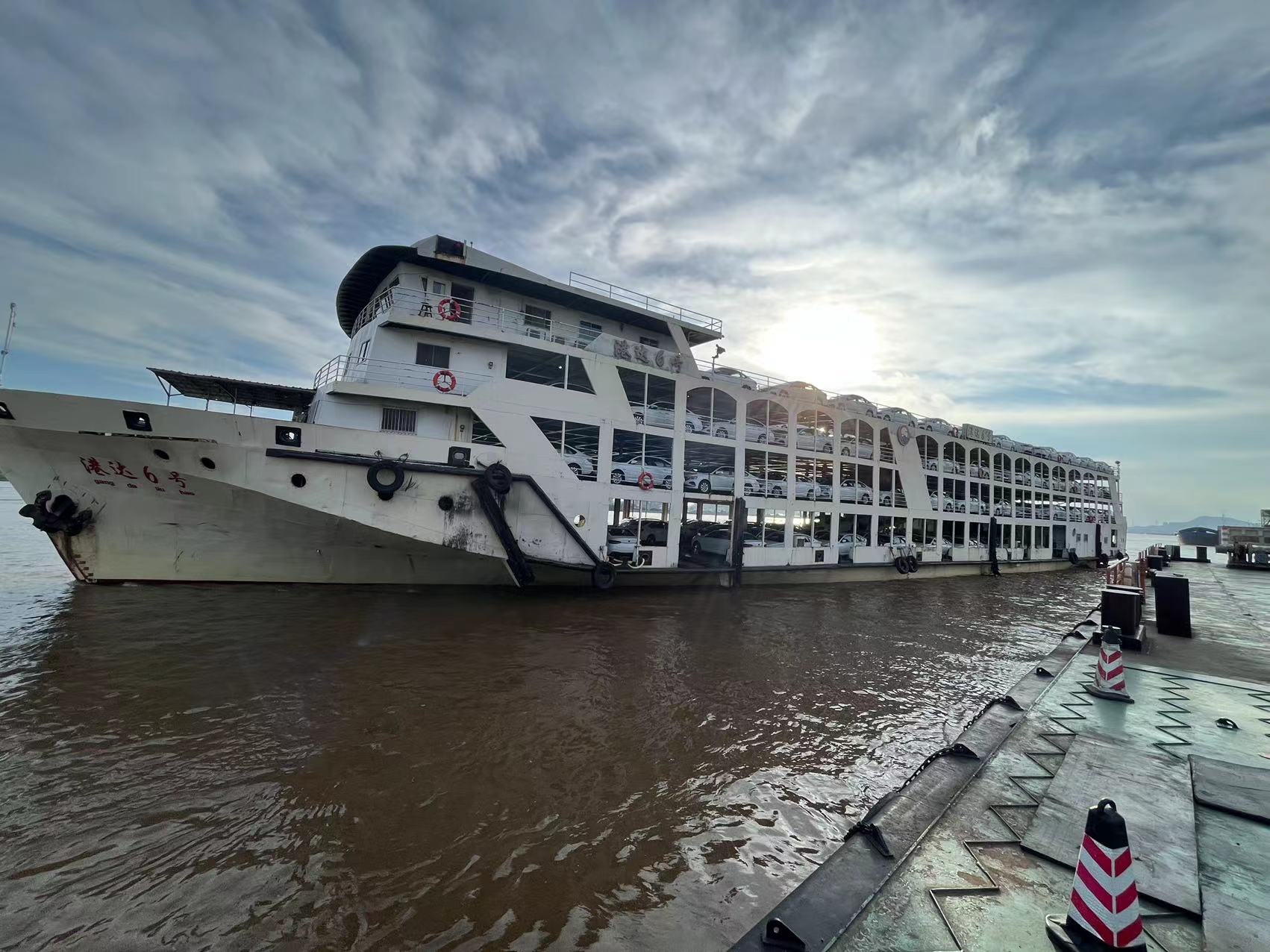 在歷經(jīng)十小時(shí)作業(yè)后,該批次車輛全部順利集港裝船。殘霞潛江波光爍,船鳴三聲水天開。18時(shí),“港達(dá)6號(hào)” 滾裝船滿載357臺(tái)上汽大眾汽車,沐浴晚霞余暉,順利駛出長沙新港碼頭。