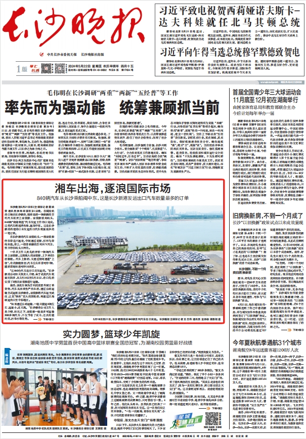 《長(zhǎng)沙晚報(bào)》(2024年5月22日 第一版) 湘車(chē)出海,逐浪國(guó)際市場(chǎng)840輛汽車(chē)從長(zhǎng)沙乘船闖中東,這是長(zhǎng)沙新港發(fā)運(yùn)出口汽車(chē)數(shù)量最多的訂單
