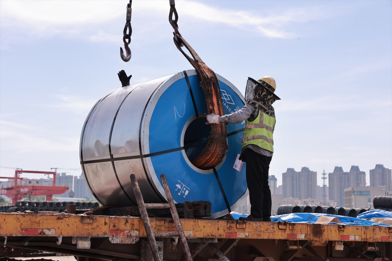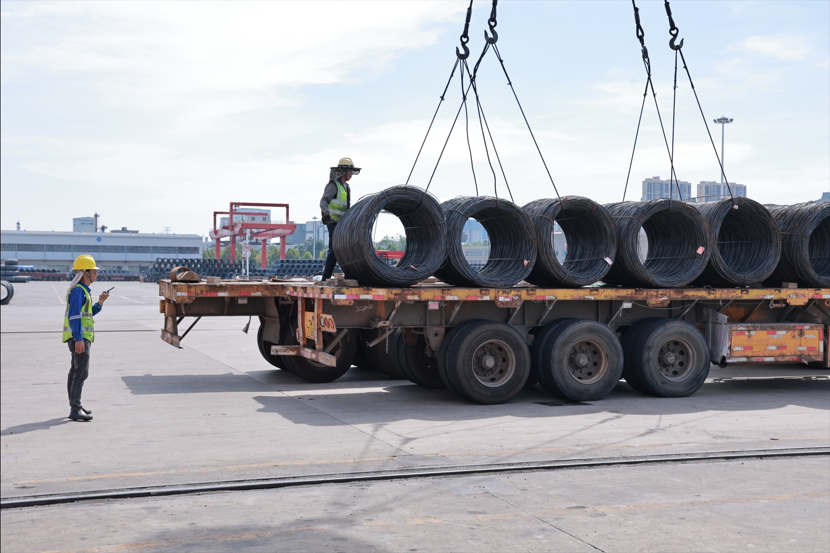 炎炎夏日,長沙新港人不畏高溫,通力合作,奮戰(zhàn)在生產(chǎn)第一線,單船作業(yè)指揮員伍賢文、裝卸工李友明現(xiàn)場指揮鋼材裝卸,保障貨物物流安全高效穩(wěn)定。 |