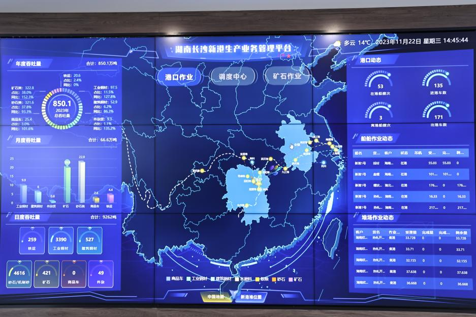 二、創(chuàng)新賦能:智慧綠色雙引擎驅(qū)動升級 數(shù)字化轉(zhuǎn)型是長沙新港三年變革的鮮明注腳。2023年,長沙新港智控調(diào)度中心和生產(chǎn)業(yè)務(wù)管理平臺全面上線,實(shí)現(xiàn)船舶動態(tài)監(jiān)測、港口實(shí)時(shí)監(jiān)控等智能化管理;2024年,“電永磁鐵吊具”等設(shè)備投產(chǎn),有效提升裝卸效率,降低人力成本;2025年,依托信息化平臺構(gòu)建“數(shù)字港+多式聯(lián)運(yùn)”模式,提高貨物周轉(zhuǎn)效率,縮短客戶報(bào)港、提貨流程。