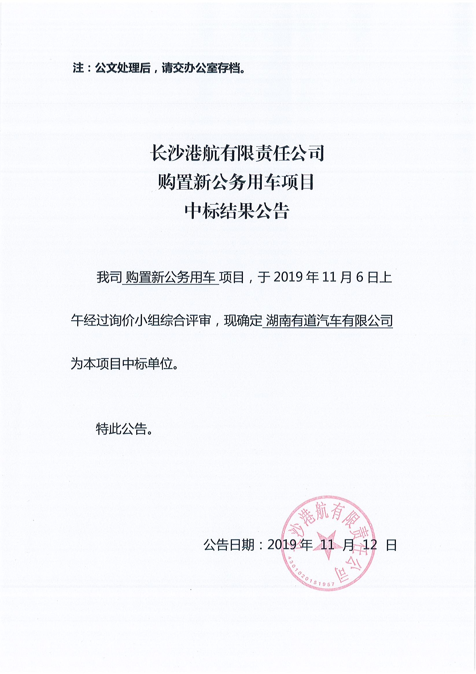 長沙港航有限責(zé)任公司購置新公務(wù)用車項目中標(biāo)結(jié)果公告
