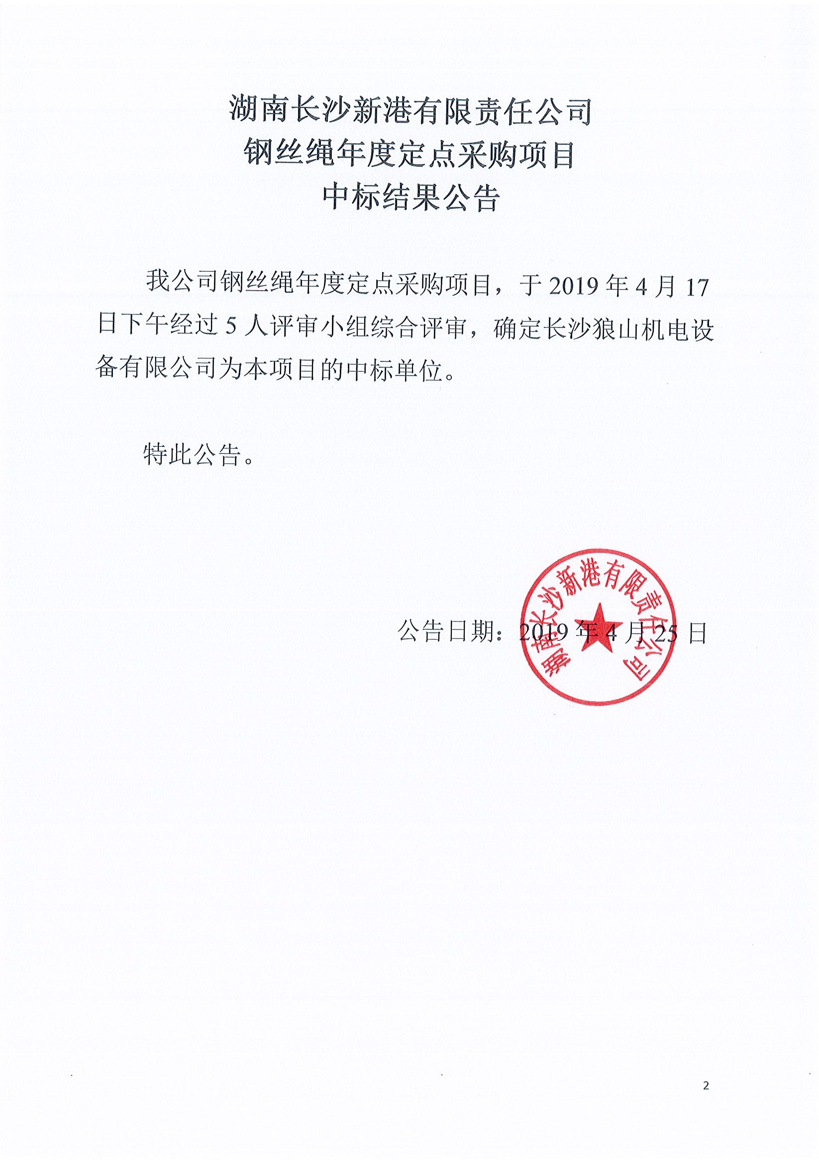 湖南長沙新港有限責(zé)任公司鋼絲繩年度定點(diǎn)采購項(xiàng)目中標(biāo)結(jié)果公告