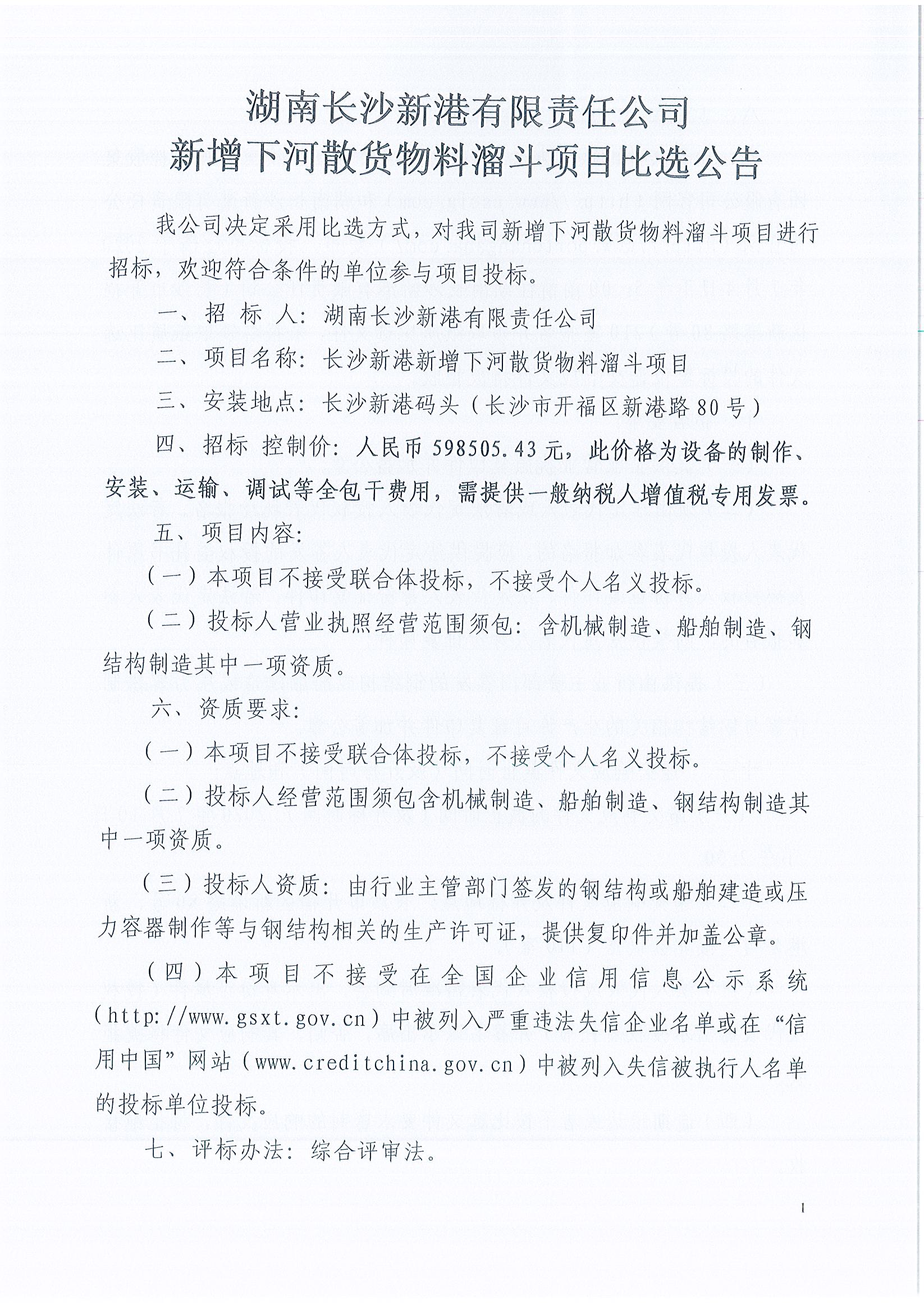 湖南長(zhǎng)沙新港有限責(zé)任公司新增下河散貨物料溜斗項(xiàng)目比選公告