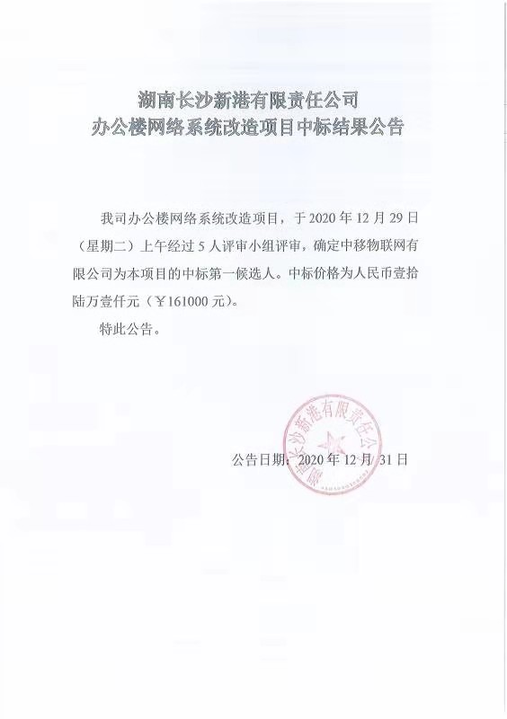 湖南長沙新港有限責(zé)任公司辦公樓網(wǎng)絡(luò)系統(tǒng)改造項(xiàng)目中標(biāo)結(jié)果公告
