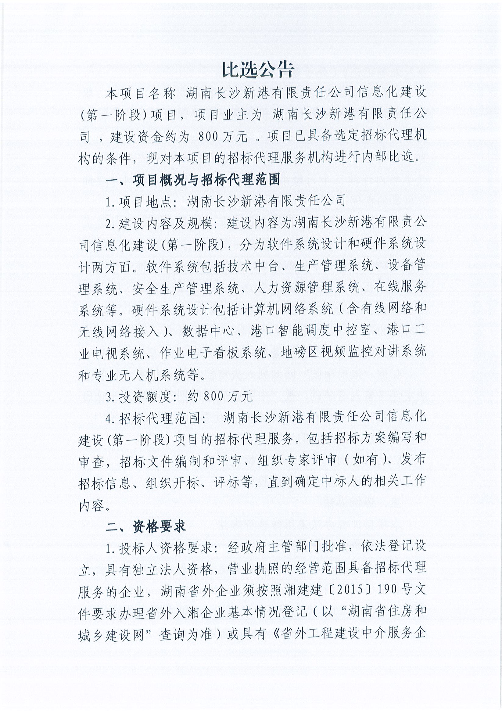 湖南長沙新港有限責(zé)任公司信息化建設(shè)(第一階段)招標(biāo)代理服務(wù)機(jī)構(gòu)比選公告