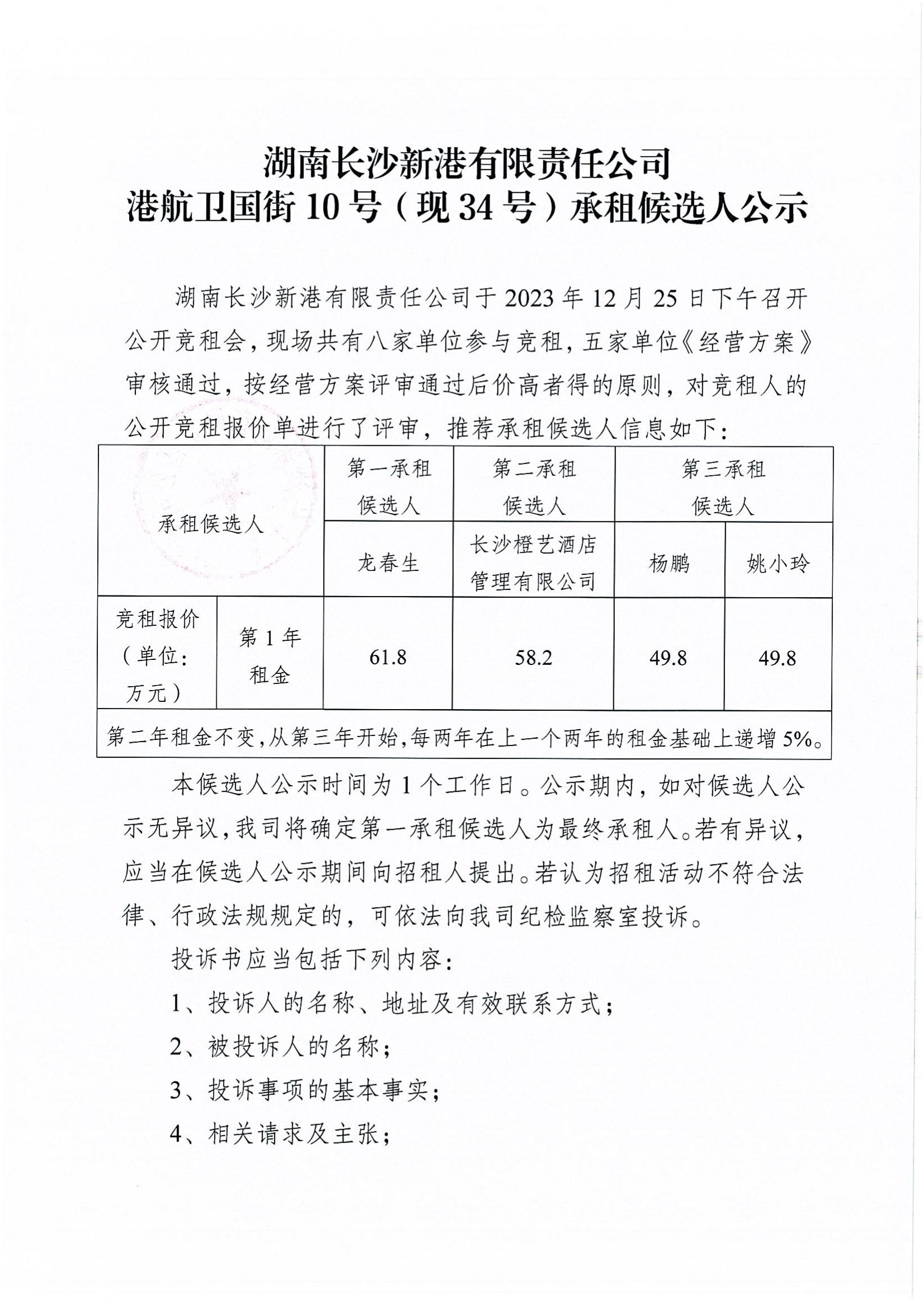 長沙新港港航衛(wèi)國街10號(現(xiàn)34號)承租候選人公示