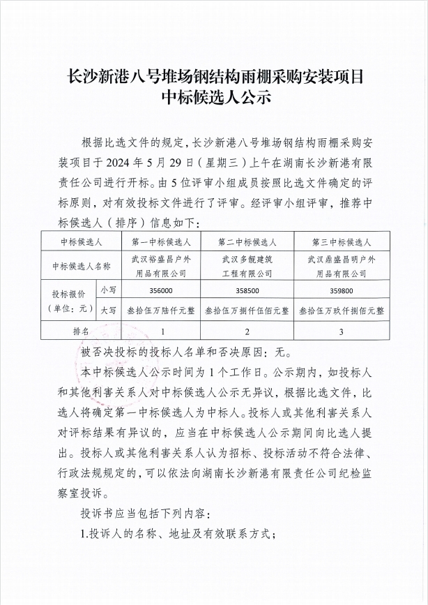 長沙新港八號堆場鋼結(jié)構(gòu)雨棚采購安裝項目中標(biāo)候選人公示