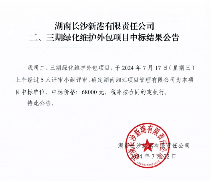 湖南長沙新港有限責任公司二、三期綠化維護外包項目中標結(jié)果公告