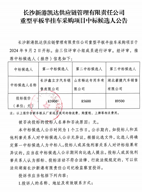 長沙新港凱達供應鏈管理有限責任公司重型平板半掛車采購項目中標候選人公告