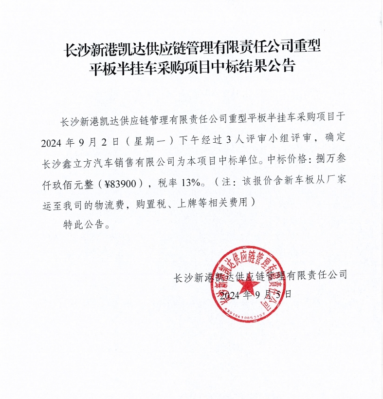 長沙新港凱達供應(yīng)鏈管理有限責(zé)任公司重型平板半掛車采購項目中標(biāo)結(jié)果公告